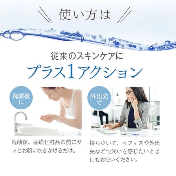洗顔後、基礎化粧品の前にサッとお顔に吹きかけるだけ。