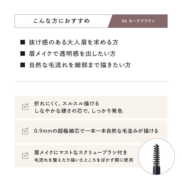 狙ったところに毛を一本一本描き足すことができる0.9mmの業界最細ペンシル。 眉頭や眉尻、自眉毛が足りない部分の隙間埋めに最適です。